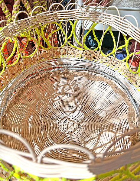 Rattan, manila rope, electrical wire, safety vest, metal sheathed cable, laser cut cork, and apricot pits